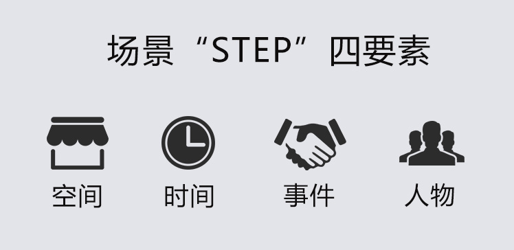 通過上面的例子,大家都有了個大致印象。那么接下來講講什么是場景?一般認(rèn)為場景是指在特定的時間、特定的空間內(nèi),發(fā)生的人與人之間關(guān)系的集合。這其中包含四個要素:時間(Time)、空間(Space)、人物(People)、事件(Event)。