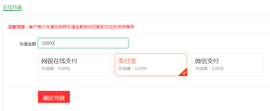 第三步:在充值頁面輸入要充值的金額,選擇支付方式后點擊“確定充值”按鈕跳轉(zhuǎn)到對應(yīng)的支付充值頁面。
