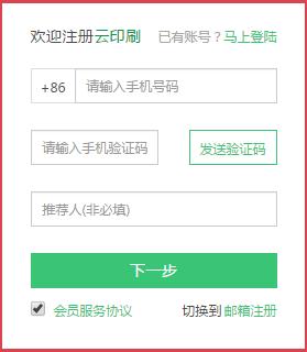3. 云印刷平臺需驗證手機號碼進(jìn)行注冊。請在注冊表單上填寫正確的手機號碼,并設(shè)置登錄密碼,即可完成會員注冊。